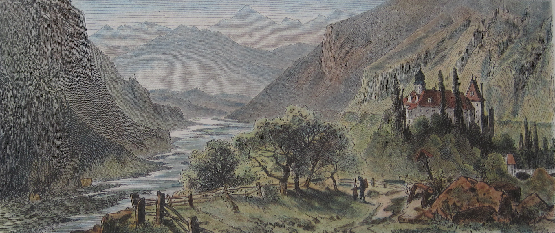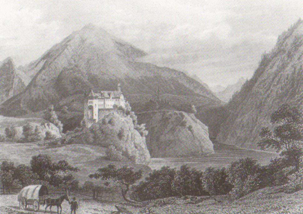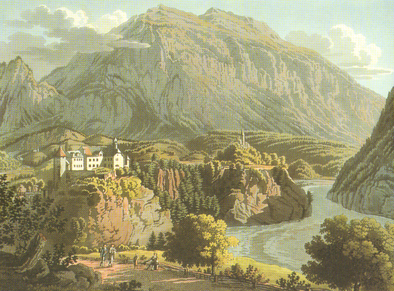 Schloss Rhäzüns / Razén von Süden her um 1825. Kol. Aquatinta von Johann Jacob Meier (1787-1858)
