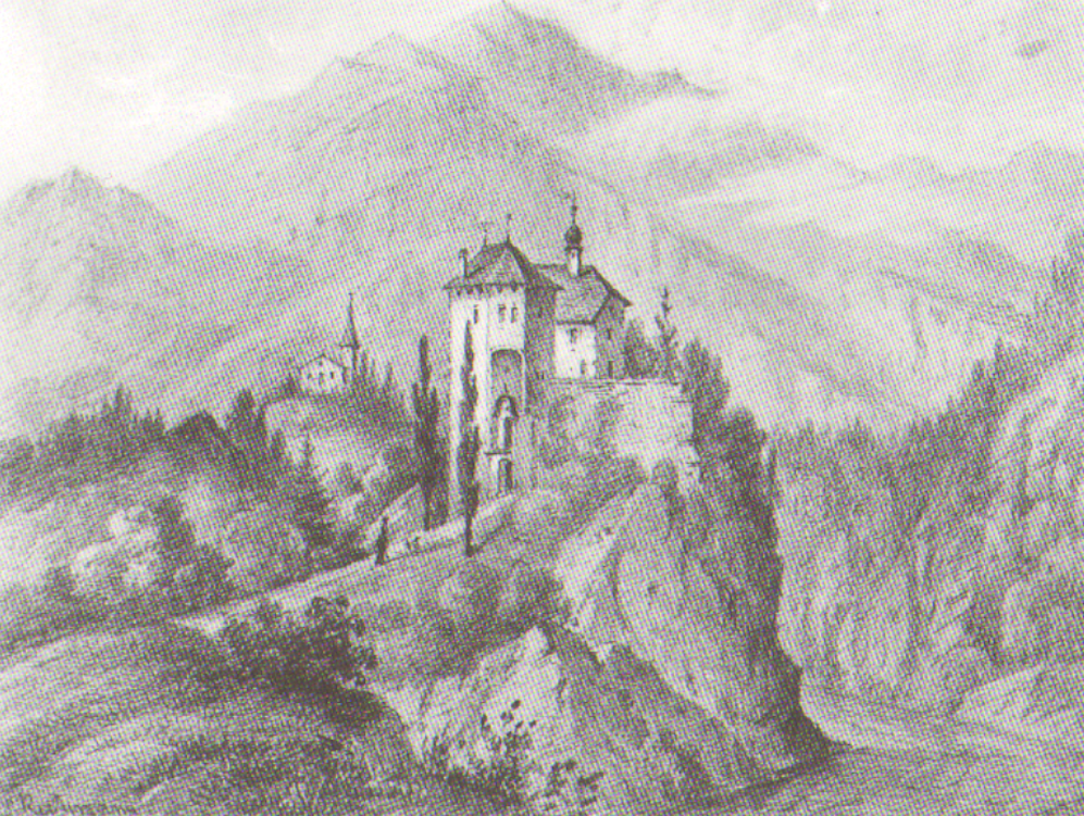 Schloss Rhäzüns von Süden her um 1808 (im Hintergrund Kirche St. Georg). Bleistiftzeichnung, erhöht mit Gouache, von Johann Jakob Rietmann (1808-1868)