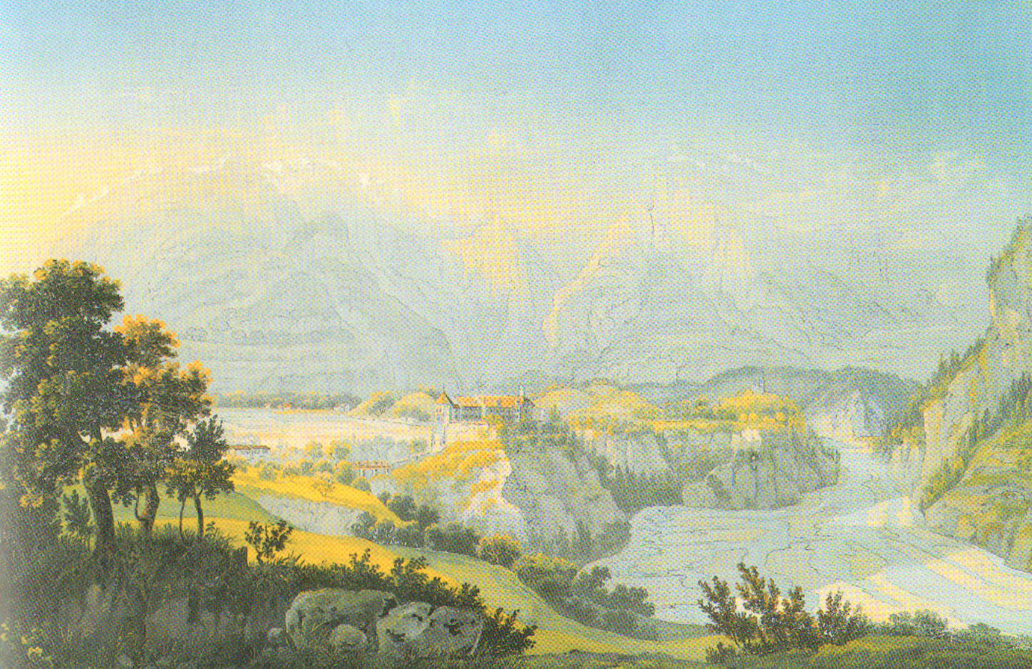Schloss von Süden her im Jahr 1818. Gouatache über Umrissradierung von Johann Ludwig Bleuler (1792-1850)