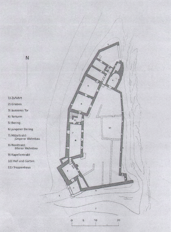 Bild aus Graubündner Burgenbuch. Grundriss: 1. Zufahrt. 2. Graben. 3. äusseres Tor. 4. Torturm. 5. Bering. 6. Jüngerer Bering. 7. Mitteltrakt jüngerer Wohnbau. 8. Nordtrakt älterer Wohnbau. 9. Kapellentrakt. 10. Hof und Garten. 11. Treppenhaus.