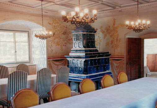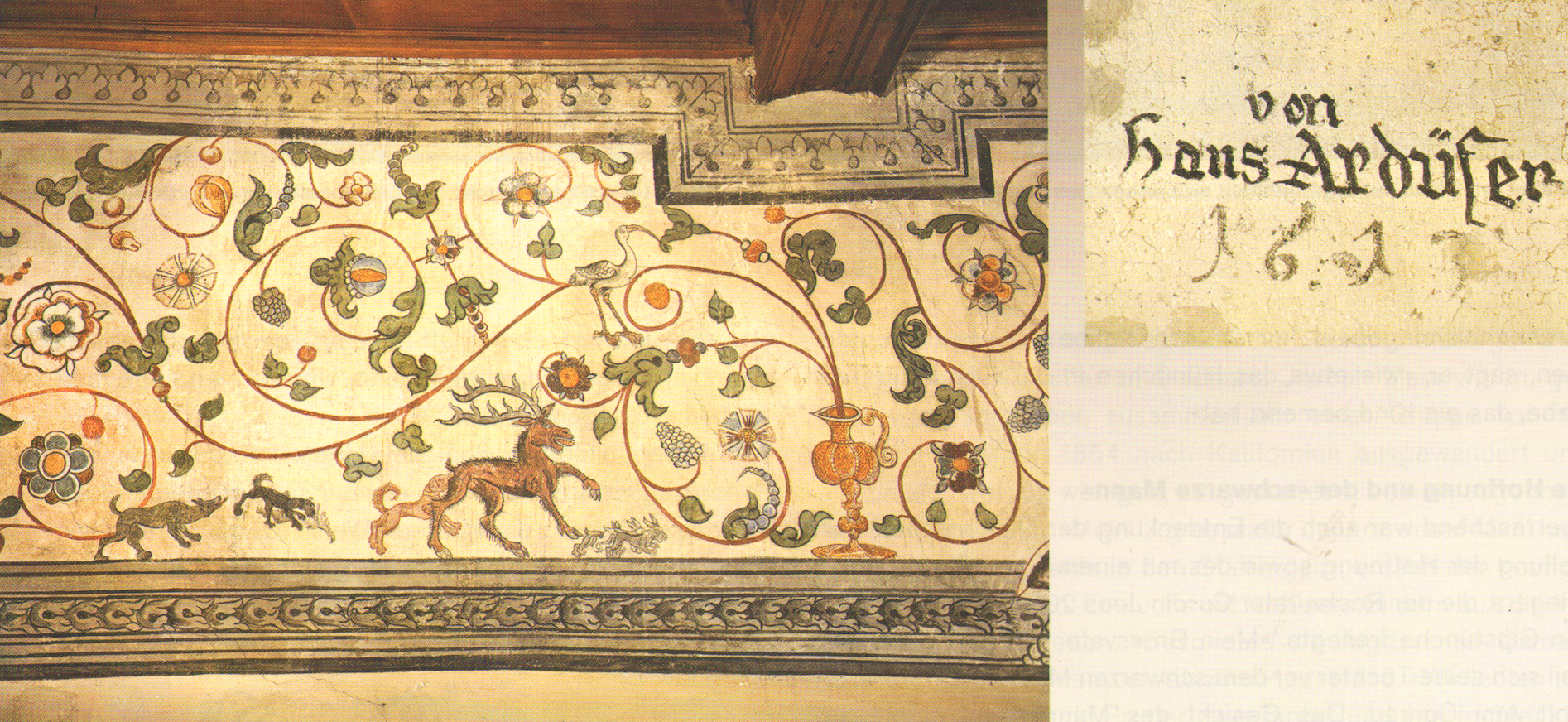 Terra Grischuna 5/2012, Rittersaal: Dekoration mit Rollwerk, Ranken und Tieren. Die dortigen Malereien hat Hans Ardüser signiert.