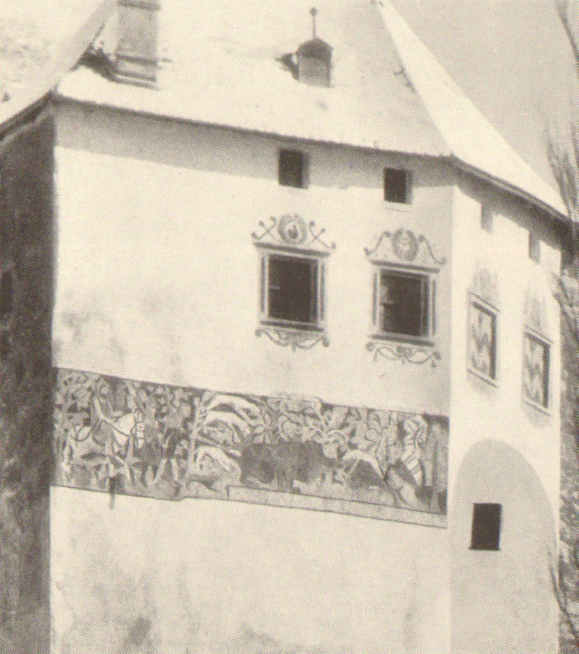 Photo 1940: aus "Die Kunstdenkmäler des Kantons Graubünden" von Dr. Erwin Poeschel, Band III, Verlag Birkhäuser Basel. Schloss Rhäzüns - Wandgemälde einer Bärenhatz und ornamentale Fensterumrahmungen.
