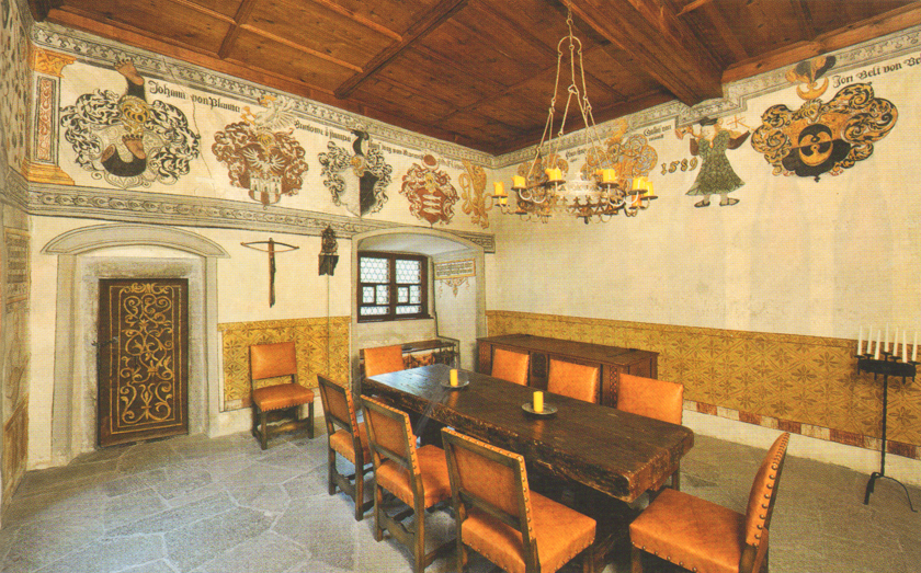 Im „Rittersaal“ (im vierten Geschoss des Turmbaues): eine Dekorationvon Hans Ardüser, an der NO-Wand, Ranken und Rollwerk mit Tieren; auf der SO- und SW-Seite: ein fortlaufender Fries von acht Wappen mit Überschriften