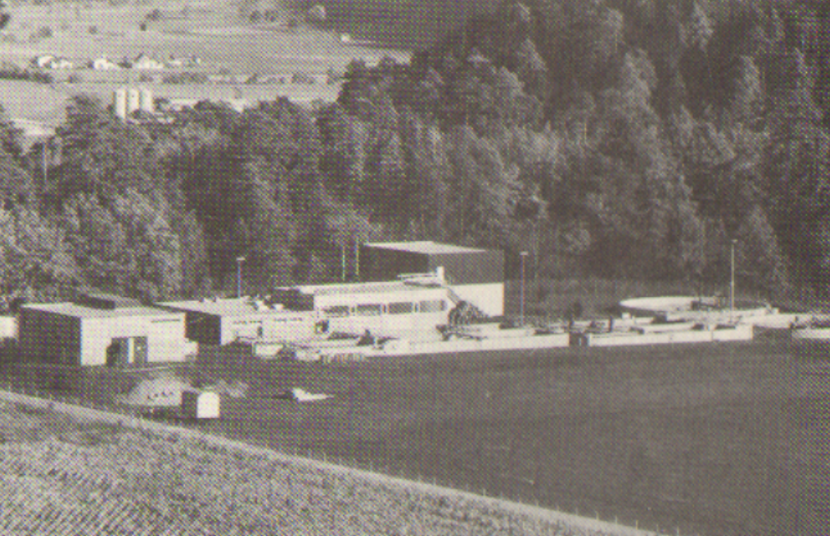 Photo aus Terra Grischuna 4/1987. Der Tuma lunga (lange Hügel) östlich der ARA gab dieser ihren Namen und schirmt sie gegen Domat/Ems, Bahn und Strasse ab.