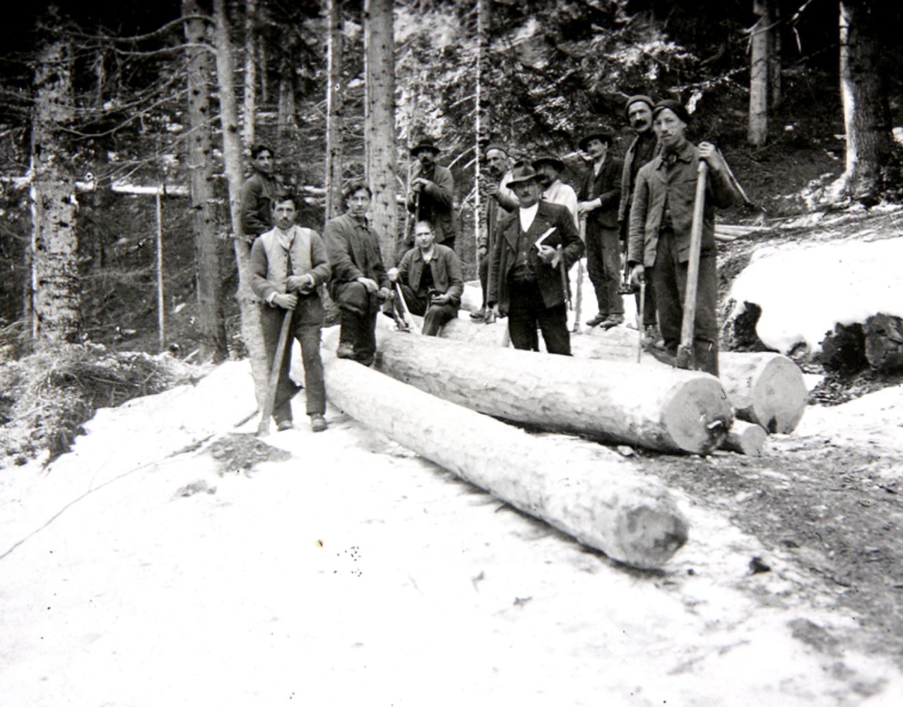 12. März 1929: Photo aus Photosammlung Silvester Camenisch-Riedi. Förster Johann Christ. Caliezi-Caminada (1878-1935) mit Forstgruppe. (Sammlung chrsp.)