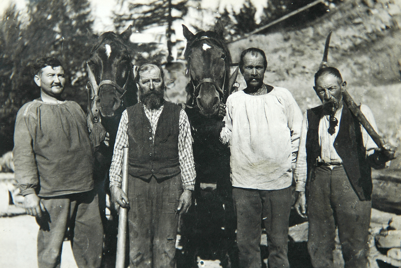 Die Fuhrmänner des Gutsbetriebes „Sägerei Rhäzüns P. Vieli & Cie.“: Albert Schneider, Josef Riedi-Schröttenthaler (1855-1945), Martin Caduff-Cajochen (1885-1960) und Plazi Monn-Tschalèr (Sammlung chrsp.)