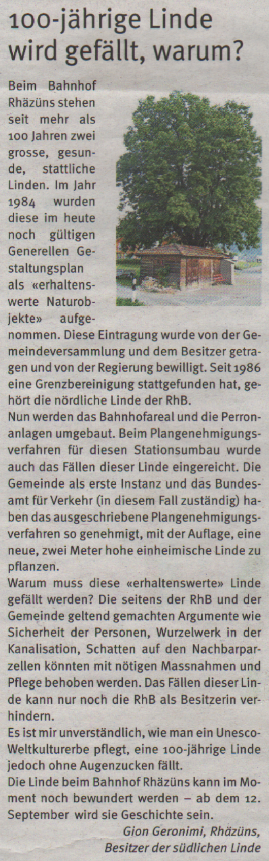 2016: Gion Geronimi. Lindenbaum von Gion Geronimi und RhB-Station Rhäzüns.